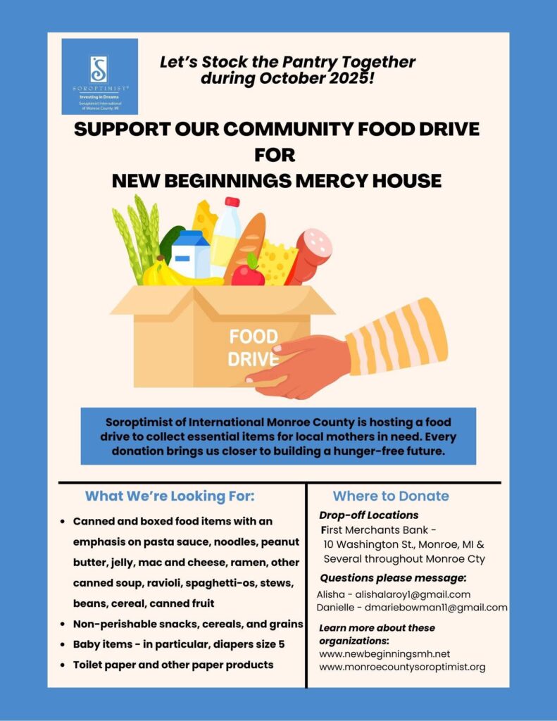 Donation box locations: Advanced Plumbing of Monroe, Brass Monkey, Trappers, Front Street Diner, Nar, Giuseppe’s Pizza, Farm Bureau Starr Agency, Gino’s Pizza Ida, Sofi Stella, Lotus Cafe, Paula’s House, Monroe County Sheriff’s Office, Amayas, Biundos, Side Track Saloon, Paul’s Quality Collision, Katie Burroughs-Coldwell Banker, Haynes Real Estate. Thank you to all the participating businesses!! Lets fill up the boxes!! Please join us every Wednesday for Bible study at 9:30am! All are welcome!